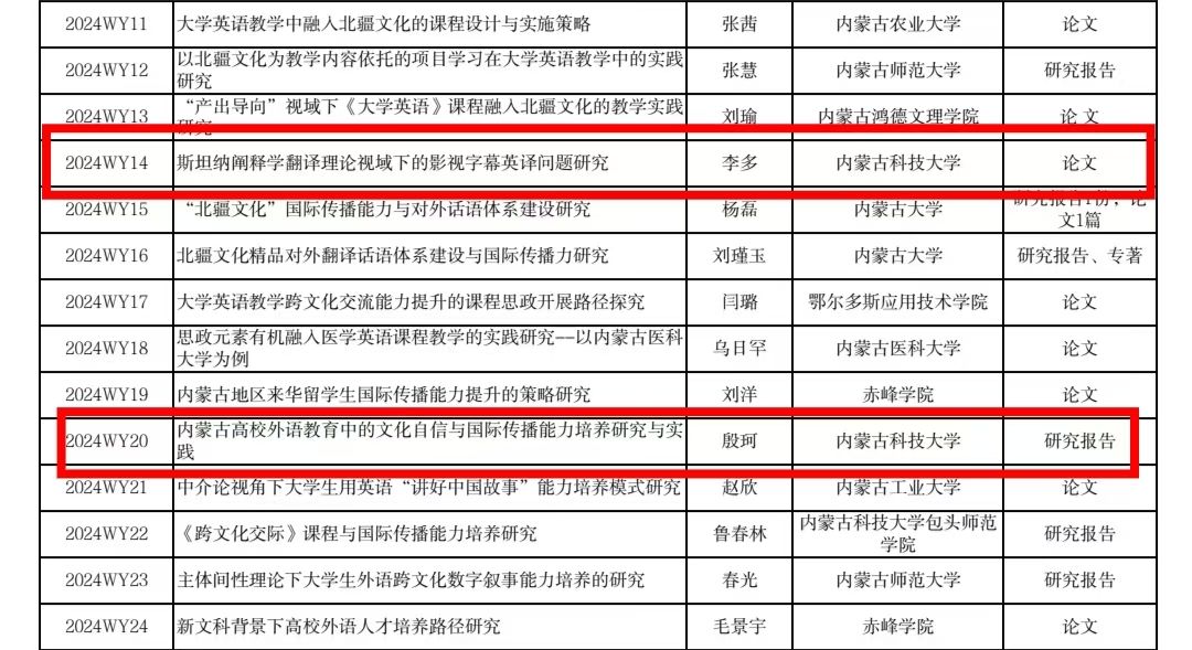 近日,内蒙古自治区社会科学界联合会公布了内蒙古自治区社会科学基金2024年度项目(部分)立项名单,公司教师李多、殷珂获批2024年度外语专项立项资助,特此祝贺!