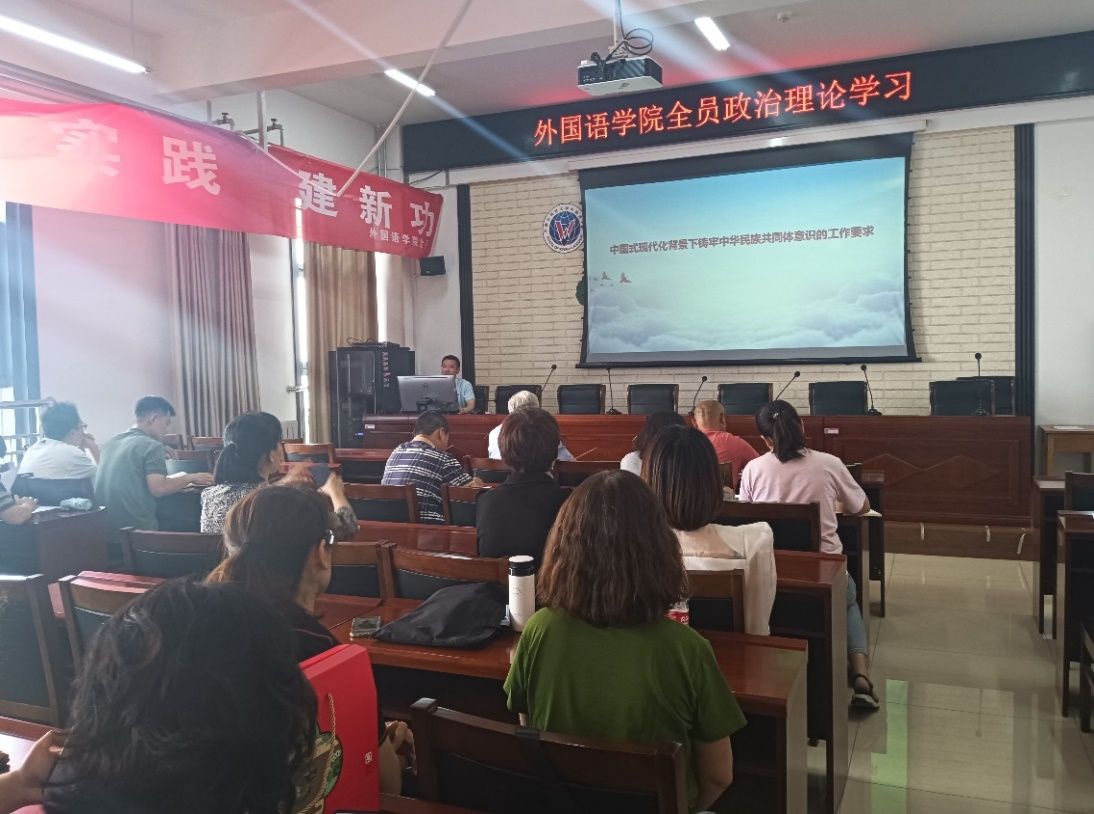 2024年6月13日下午,外国语公司在明德楼A205会议室组织全体教职工进行政治理论学习。邀请了马克思主义公司教授冯大彪进行了题为《中国式现代化背景下铸牢中华民族共同体意识的工作要求》的讲座。