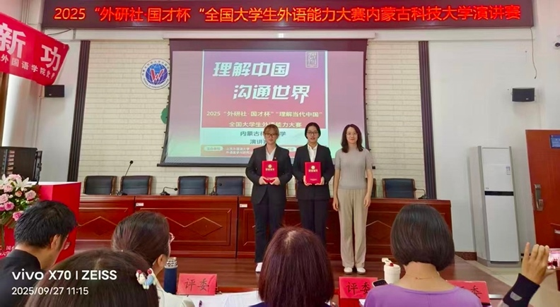 9月27日,太阳成集团tyc539成功举办2025“外研社•国才杯”“理解当代中国”全国老员工外语能力大赛英语演讲校级选拔赛。经过激烈角逐,材料科学与工程公司肖竣夫荣获一等奖,文法公司张楚晗与马克思主义公司宋昱霖分获二等奖,三位同学将代表公司参加内蒙古自治区复赛。